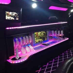 Our limousine is fully loaded with a LED ceiling, LED partition, LED disco floor, and LED/fiber optic bar that changes color with customer selectable modes/colors, a double din stereo with Bluetooth, Carplay, AM/FM/XM/Sirius Satellite Radio, CD/DVD player, and three color monitors. In addition, our stereo features LED speakers and two subwoofers for awesome sound.